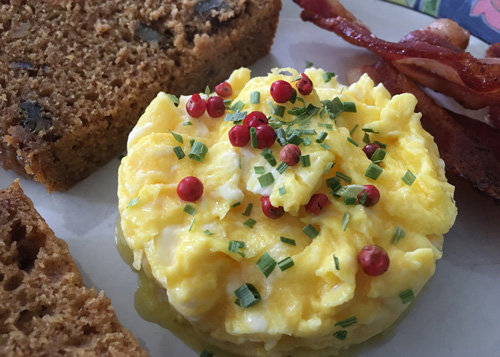 To elevate humble scrambled eggs into an elegant meal, I put the cooked eggs into a 3” round cookie mold (as you would use for steak tartare) and top them with some chopped fresh chives and pink peppercorns.