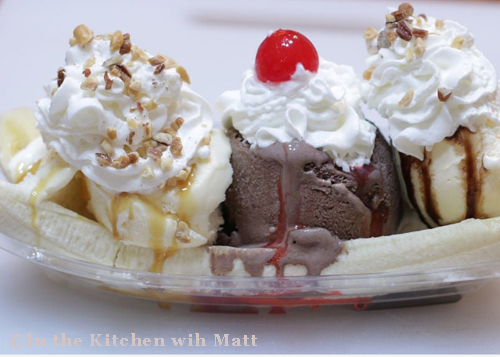 Said to have been invented in 1904 in Latrobe PA, banana splits were the brain child of assistant pharmacist, David “Doc” Strickler, who helped out at the soda fountain. Traditional banana splits were made with chocolate, vanilla and strawberry ice creams topped with three different toppings. The colors mimicked another common dessert, Spumoni, often served at banquets. If the bananas were cut crosswise and the ice creams were crowned with whipped cream, nuts and a cherry on top, then you were the lucky recipient of a “banana royale.” Yowzah!