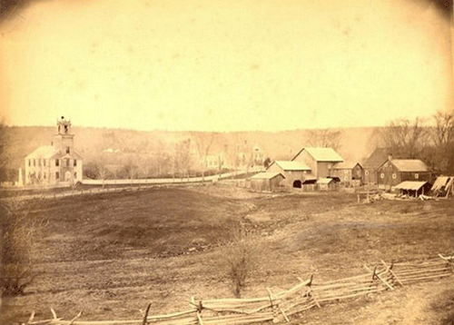 Shown here is the old Barkhamsted Hollow Episcopal Church, built in 1816, and a neighboring farm. They were flooded between 1940 and 1948 when the reservoir was finally filled. Other civic buildings and the old cemetery were relocated above the waters in old Barkhamsted Center.