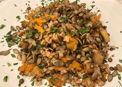 I want the dish to be tasty and satisfying but it must be nutritionally sound. I don’t care to make things complicated or showy. Balance is important both in flavor and ease of preparation. This pilaf is nearly foolproof by precooking the barley and the lentils then baking them for a short while to meld the flavors and textures. As a point of reference, a pilaf doesn’t have to be rice and peas. Pilaf is a way of cooking grains in an oven, usually covered, until the liquid has been absorbed, resulting in grains that do not adhere to one another. It is not dependent upon particular grains and garnishes.