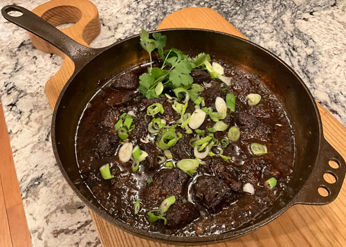 So this is where I am today. I have two recipes, both from Asian backgrounds. One from Korea and the other from China. The greatest influence is Korean Bulgogi, or roughly translated “fire meat.” It consists of thinly sliced beef, pork or chicken marinated in a slurry of soy sauce, garlic and sesame oil then grilled on a charcoal fire or seared quickly in a pan. It is often served in a lettuce leaf wrap with rice and gochujang, a red pepper paste and/or kimchi. The other influence is Tepong Pork with similar flavors; often a whole pork shoulder braised slowly for hours. I like the idea of Bulgogi but wanted to create something like shredded beef to be served in a sandwich or a stew with some rice and veggies. It could stay in the fridge and warmed in the oven or microwave without the fuss of grilling. Also I wanted to christen a new cast iron braising pan I purchased in Portland, Maine.