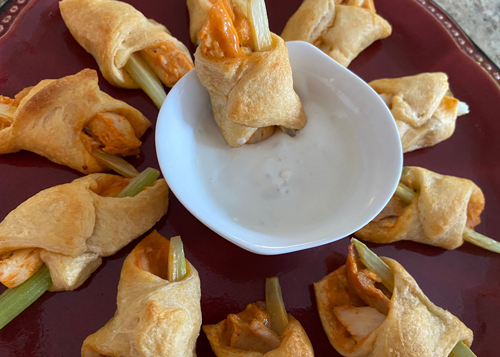 Lightly spray the roll-ups with a little olive oil spray to help the dough brown evenly while baking. Bake at 375 degrees for 10 minutes until lightly browned. Use a spatula to place the warm buffalo blankets on a serving platter.