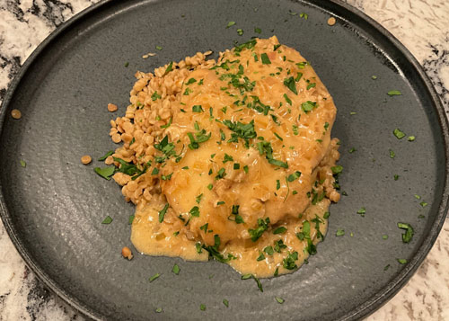 It is simple to prepare and elegant on the plate. It is best served with a grain or pasta to soak up the sauce. I make it heavy on shallots with a small amount of cream to help stabilize the sauce. The sauce is a beurre blanc or butter sauce. Anytime you’ve eaten in a restaurant and experienced beurre blanc sauce, it’s mostly butter caught up in a temporary emulsion that is silky smooth. With a chef’s deft hand, the sauce is properly seasoned and so good.
