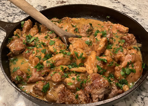 I’m calling for chicken boneless skinless thighs for they hold better in a braise or stew. The addition of sausage, which is unusual, works well in the recipe and adds some interest to a familiar dish. Crimini mushrooms can be substituted for any farmed or wild mushroom. In place of the Marsala wine, you can use Madeira, a dry port or sherry. I like buttered noodles or fluffy long grain rice with this braise but mashed potatoes or polenta work as well. Rice flour can be substituted to make it gluten-free and cashew cream or non-dairy unflavored cream can substitute for heavy cream.