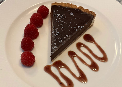 Cut into small portions, at least 8 for this sized tart as it is very rich, and serve with the berries and whipped cream if using
