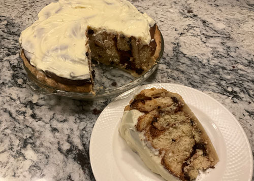 If you look on the internet, you’ll find several recipes for this baker’s delight. Most go for the shortcut and use prepared pie shells from the grocery store and cinnamon roll dough from the freezer section. I don’t have a problem with that for many home cooks have to multitask. That said, if you have the time to make this from scratch, you’ll find a huge difference. One shortcut I would consider is to make the cinnamon rolls with sweet biscuit dough instead of the yeast risen variety. It would save time, and though it will lack the yeasty goodness, I have no doubt it would still make a tasty treat.