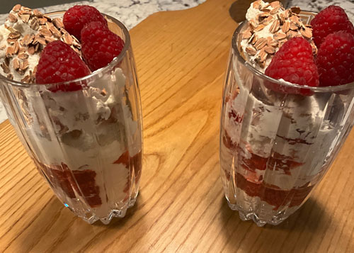 It’s called Cranachan. This is a traditional Scottish dessert, sometimes called the King of Scottish desserts. It typically contains whipped cream, fresh raspberries or other berries in season, whiskey (Scotch), honey (Heather) and toasted oats. The only thing cooked are the oats, toasted in the oven or skillet. Usually the treat is layered in a bowl like a trifle or in individual glasses like a parfait. Often it is served in celebration of Scotland’s poet on Robert Burns Night.