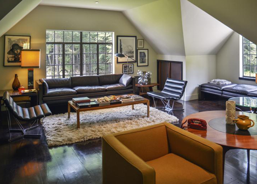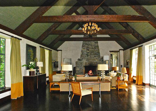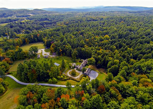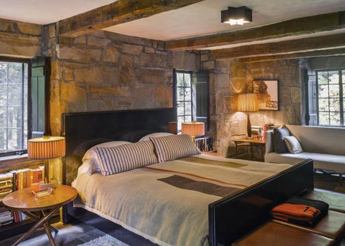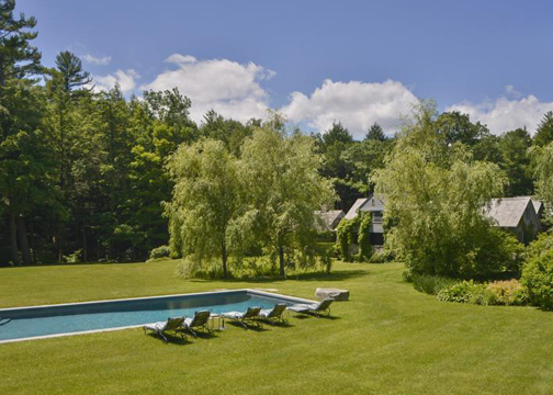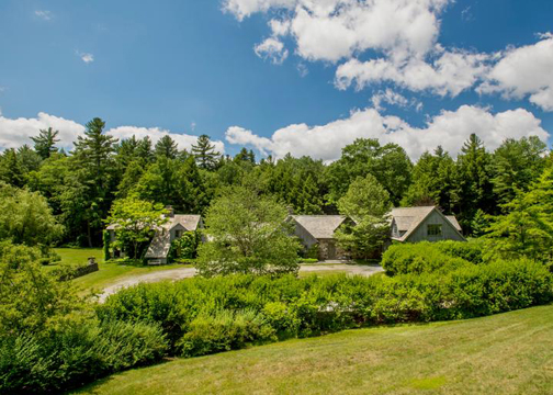 An enchanting stone-and-timber compound on forty-three acres and one of Berkshire County's most atmospheric and luxurious properties is a magical world unto itself. A driveway winds through horse pastures and leads under a porte cochere to a European-style courtyard where a pergola draped in wisteria links the entrances to this five-bedroom house, three-bedroom guest house and a terrace with an outdoor dining pavilion.