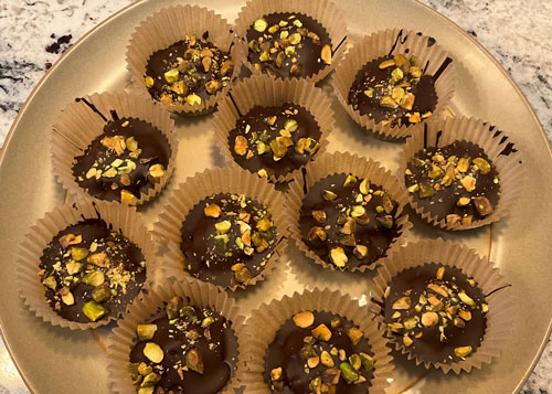 I thought there might be a simpler way. Many recipes require a silicone mold. I don’t have one and suggest you not purchase one. Kataifi phyllo dough is an ingredient not easy to find. Pistachio paste or cream is available and should be found where one can buy tahini sesame paste. You can make a serviceable substitute by grinding your own pistachios with a little confectioner sugar and some neutral oil. The solution to replacing kataifi is to use shredded wheat. It’s inexpensive, readily available and similar to the kataifi when toasted. I thought it an original idea until I found that others had similar thoughts. Darn it. Another challenge is the chocolate bar mold. So, to get around that, I use muffin papers. A silicone muffin pan would work but the papers make individual or bite sized pieces.