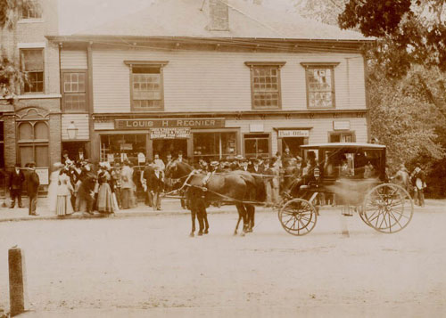 The building that housed the post office, seen at the right of the picture, was probably built by Louis Regnier around 1900. He had purchased a dwelling on Main Street, built circa 1850 and moved it about 60 feet to its current location at the corner of Franklin and Main where he then built the Regnier Block which contained at least three stores.