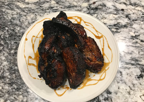 I find these ribs do not need or want a traditional BBQ sauce but I do enjoy some sweet heat from a drizzle of hot honey, a honey infused with capsicum containing chilies. It’s easy enough to replicate a facsimile by mixing a tablespoon or so of your favorite hot sauce into a cup of honey. My choice here would be a robust honey such as buckwheat.