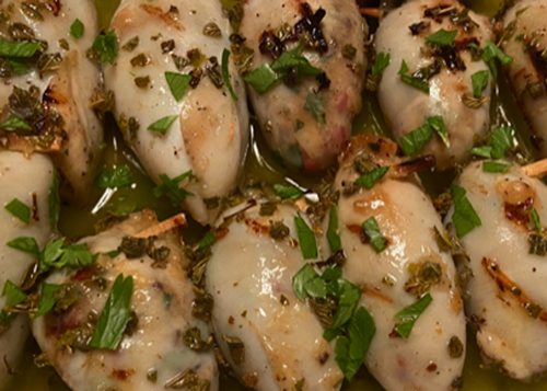 After stuffing, all it took was 3 minutes per side on a hot grill and dinner was ready. I served the grilled calamari with a light Greek-style lemon dressing. Despite the fact that squid comes pre-cleaned, I always rinse them and check the insides for any residual cartilage and feel the base of the tentacles to make sure that the “beak” has been fully removed. Calamari is often tenderized by soaking in buttermilk but I find that marinating it in Italian or Greek salad dressing gives it extra flavor while also helping to tenderize.