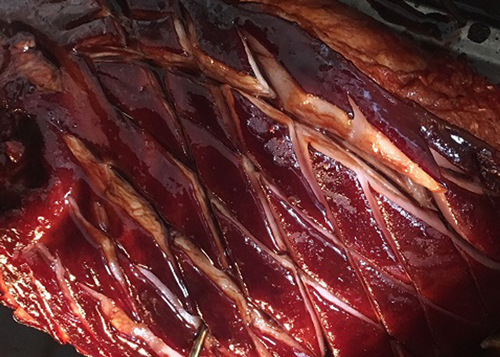 In the 1950’s our parents often decorated ham with a collage of pineapple rings and maraschino cherries studded with cloves over a brown sugar glaze. Cloyingly sweet! I needed something more sophisticated – elegant and flavorful – with a combination of slightly sweet and smoky. A simple four-ingredient glaze was the perfect balance. My husband loves the smoky peaty single malt scotches that come from the island of Islay off the west coast of Scotland. So I decided to steal a quarter of a cup of his smokiest scotch, Ardbeg, and use that as the base for my glaze, hence the name “Islay Ham.” I cannot begin to describe the phenomenal aroma that wafted through our house as that ham cooked! We were only too happy to open the oven to gently paint on more glaze resulting in what looked like a lacquered mahogany colored ham.
