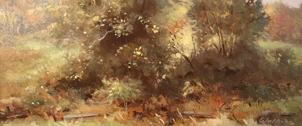Watkins studied at the Art Students League of New York where she learned the prismatic palette, alla prima (wet on wet) painting, and techniques of the Old Masters. Today, she is a plein-air landscape painter who uses oil sketches made in the field to inform later studio compositions in which she attempts to capture a sense of place and the quality of the light.