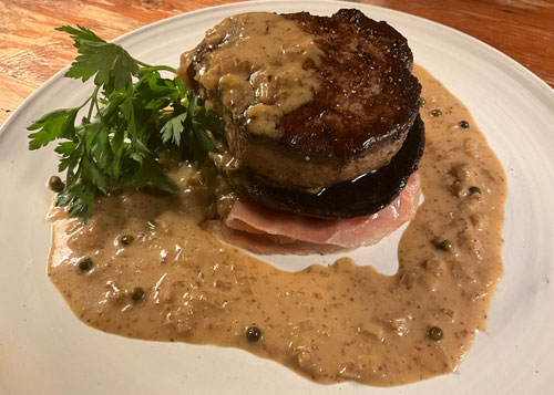 A very nice plate for a special occasion and can be made for more than two easily. A thin slice of pate adds complexity and tradition to the dish. For a budget friendly and casual dinner, I suggest substituting a nice ground beef patty in place of the filet mignon and call it burger deluxe! It will have all of the flavor profile of the steak, without the cost.