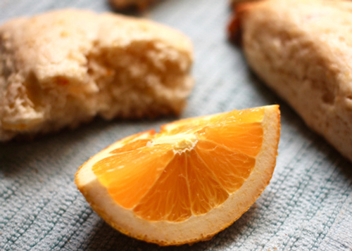 3 Add butter to dry ingredients; mix with hands or a pastry cutter until the mixture is crumbly and mealy. Form a well in the middle of the mixture and add 3/4 cup of heavy cream and 1 tablespoon freshly-squeezed orange juice. Use hands to combine mixture until all ingredients are incorporated