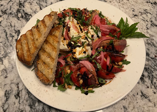 We also have incomparable fresh vine-ripened tomatoes. Picked at the peak of ripeness they are sweet and succulent and, surprisingly, pair well with peaches. Grilling the peaches adds a tantalizing fire-born flavor of the caramelized natural sugars. In this recipe, the peach and tomato flavors come together with the rich and creamy counterpoint of burrata cheese. Together, accented by pickled red onions, toasted pine nuts, aged balsamic vinegar and basil, this salad calls out summer.