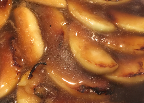 To the cup of strong tea, mix together 1 tablespoon brown sugar, 1 tablespoon Dijon mustard, 1 teaspoon mustard seeds, a teaspoon of apple cider vinegar, and 2 teaspoons cornstarch. Add to the apples and simmer for about 2 minutes until hot and thickened. If you want the mostarda to be spicy you may add a scant 1/8 teaspoon of ground cayenne pepper.