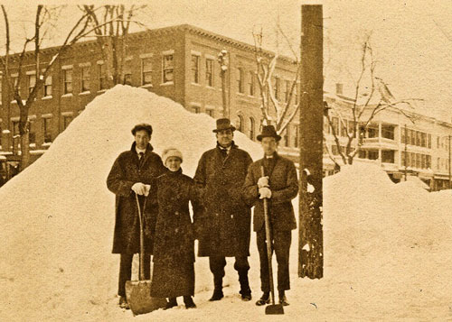 A mountain of snow blocked the view of Main Street. In the days before motorized sidewalk plows, walks were cleared through manpower.