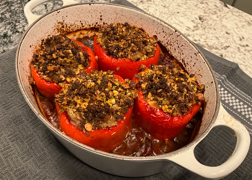 The important criteria was for it to be vegetarian. I was inspired by a dish that was Asian and vegan. I experimented and had no recipe to follow so I compared it to similar dishes. Instead of tofu stuffed cabbage, use red bell peppers filled with tofu and rice; braise it in a stew of mushrooms and tomato. I use red bell peppers because they are sweet. Yellow or orange are fine, not the green.