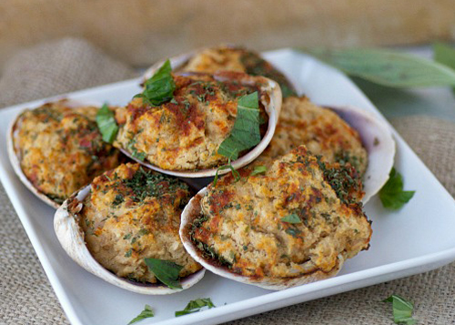 Place a heaping mound of the mixture into a quahog shell. You will have enough to stuff about 24 quahogs. Place the quahogs, stuffing-side-up on a baking sheet.
