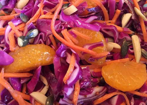 I wanted to create a cabbage salad that looked and tasted different from the usual white cabbage and mayonnaise base. I started with a combination of finely shredded red cabbage and carrots which looked beautiful together in a bowl. Complimenting the colors and adding a bit of sweetness, I added a can of drained mandarin oranges. I kept the “orange” theme while creating a light vinaigrette made with orange juice, white balsamic vinegar and olive oil. To balance out the flavor I added a little stone-ground mustard, honey and some white miso paste for saltiness and a little “umami.”