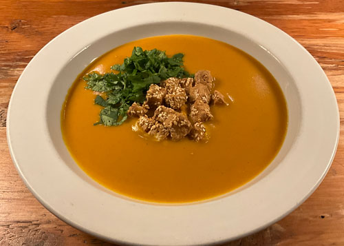 SWEET POTATO CURRY SOUP with SEASONED TOFU CROUTONS