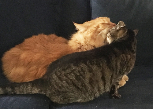 She followed Eric everywhere, rubbing against him, washing his ears, lolling in front of him, trailing her tail seductively under his chin as she walked by. I thought, surely, she was courting rejection once again but, amazingly, he warmed to her advances. He washed her face and ears in return, slept cuddled against her, deigned to let her drink in his magnificence.