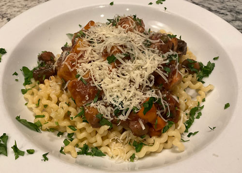 Serve over pasta, polenta, rice or another starchy base with a shower of chopped parsley. A little grated Parmigiana over top, a nice addition if you’re not dairy free