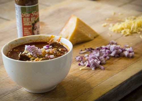 This chili is a far cry from the bland “ground beef / canned beans / little packet of powder” version many folks make at home. Sando’s recipe calls for cubes of chuck beef, plenty of Mexican spices, a little bitter Mexican chocolate and believe it or not, a bottle of dark beer. After sautéing some onions and garlic, the spices are added and cooked, coating the vegetables in what could be described as a Mexican roux.